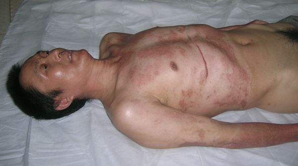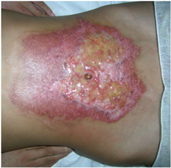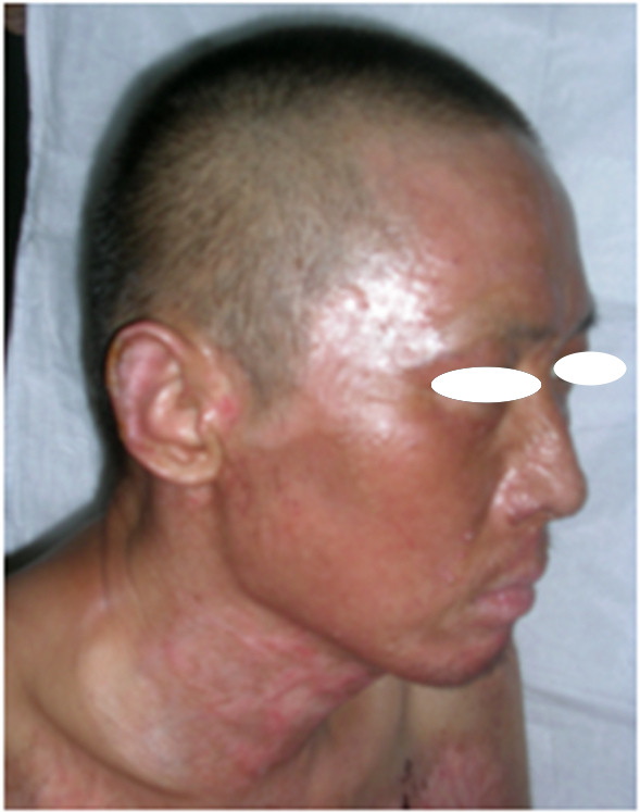 文章来源:本站原创 作者:百蕊药业 时间:2013-7-3 【病例简介】 患者男 ,36岁。住院号:7001505 工作单位:邹城市大束镇 全身被汽油烧伤1小时急诊入院。入院诊断: 烧伤 (火焰)80%BSA,Ⅱ-Ⅲ°,全身。入院后给予右锁骨下静脉插管,建立静脉通道,快速补液;抗生素预防感染及静脉营养支持等综合治疗,烧伤创面清创,清创后躯干四肢行戊二醛皮覆盖疗法,面颈部则应用一途牌 生肌育肤膏 暴露疗法(图1),涂药厚度1mm,每4-6小时更换一次;用药后第10天,面颈部创面坏死组织被消化殆尽(图2),继续 ...