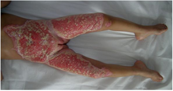 文章来源:本站原创 作者:百蕊药业 时间:2013-7-7 【病例简介】 患者女,6岁。住院号:7001315 住址:邹城市石墙镇常峪村 热水烫伤双大腿、腹部及会阴20小时入院。入院诊断: 烧伤 (热水)16%BSA,Ⅲ°,双大腿、腹部及会阴(图1) 入院后简单清创,清创后予以一途牌 生肌育肤膏 暴露或半暴露疗法,第10天创面坏死组织液化达高峰(图2),,第17天创面坏死组织被液化殆尽,创基再生散在“皮岛”(图3),继续用药,第30天大部分创面再生修复愈合(图4),坚持一 ...