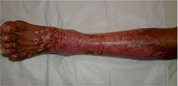文章来源:本站原创 作者:百蕊药业 时间:2013-7-9 【病例简介】 患者男,45岁。住院号:7009321 左下肢被热水烫伤6小时而急诊入院。入院诊断: 烧伤 (热水)7%BSA,浅三度,左下肢(图1) 入院后烧伤创面简单清创,清创后创面予以一途牌 生肌育肤膏 暴露疗法,药膏厚度1mm,每4-6小时更换一次;第14天创面坏死组织基本被消化清除(图2),继续用药,在一途牌 生肌育肤膏 的培育下,于第21天大部分创面再生修复(图3),至第36天创面自愈,愈合后无瘢痕(图4)。 ...