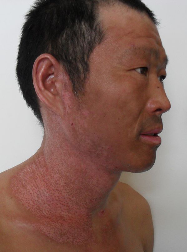 文章来源:本站原创 作者:百蕊药业 时间:2013-8-8 【病例简介】 患者董**,男,47岁。 住院号:7052897 工作单位及地址:邹城市市恒源汽修公司 联系电话:13793751493 面部Ⅱ° 烫伤 ,3%BSA(图1) 入院后创面清创,清创后创面应用一途牌 生肌育肤膏 暴露疗法,涂药厚度1mm,每4-6小时更换一次;治疗第4天腐皮脱落(图2),用药至第9天创面再生修复(图3),愈合后3个月面部皮肤复原、无 瘢痕 (图4)。 &nbs ...