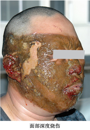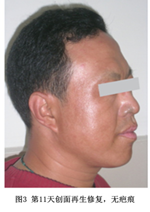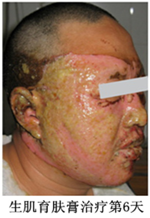 【病例简介】 患者男,39岁。住院号:0801157203 工作单位:兖矿集团东滩矿电厂 在工作中线路短路被电弧烧伤面颈部2小时急诊入院。诊断:烧伤(电弧)5%BSA,深Ⅱ°,面颈部(图1) 入院后创面清创,清创后行一途牌生肌育肤膏治疗,暴露疗法,药膏厚度1mm,每4-6小时更换一次。伤后第6天,创面坏死组织液化正常(图2),继续用药,第11天创面再生新皮肤;愈后无疤痕,皮肤弹性和色泽正常(图3).