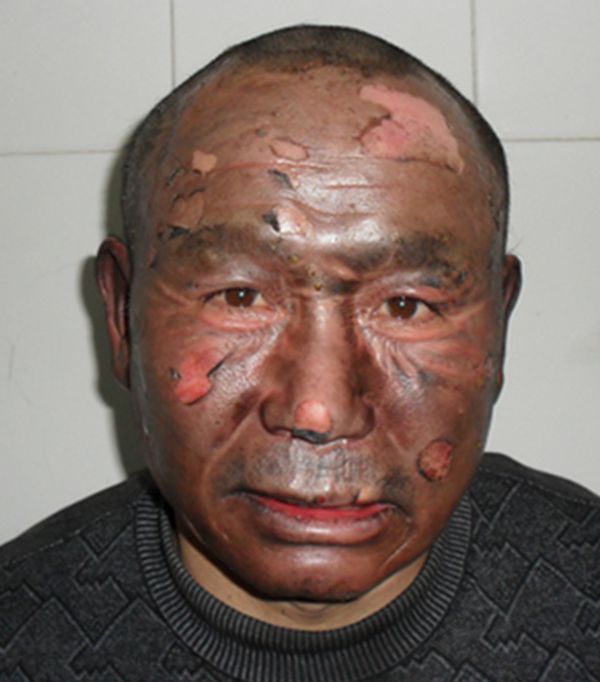 【病例简介】 患者董**,男,47岁。 住院号:7052897 工作单位及地址:邹城市市恒源汽修公司 联系电话:13793751493 面部Ⅱ°烫伤,3%BSA(图1) 入院后创面清创,清创后创面应用一途牌生肌育肤膏暴露疗法,涂药厚度1mm,每4-6小时更换一次;治疗第4天腐皮脱落(图2),用药至第9天创面再生修复(图3),愈合后3个月面部皮肤复原、无瘢痕(图4)。