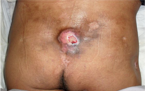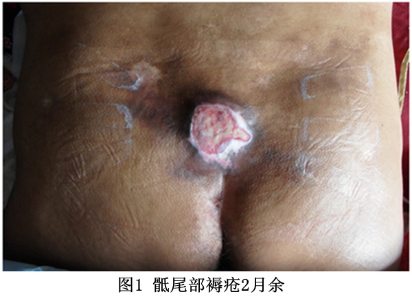 褥疮系皮肤因长期受压而导致局部皮肤血液循环和营养障碍而引起的组织破损和/或坏死。按国际分级方法压疮(褥疮)分四级,本例为典型Ⅲ期压疮。患者男性,43岁,因高位截瘫多年,长期卧床,骶尾部反反复复起褥疮,本次复发骶尾部褥疮大小3cm*3cm,经几种褥疮膏治疗2月余不愈(图1),改行生肌育肤膏治疗15天,创面由暗红色变为淡红色,疮面缩小一半(图2),继续用药,在一途牌生肌育肤膏的培育下原位再生出新皮肤,第38天疮面愈合(图3)。