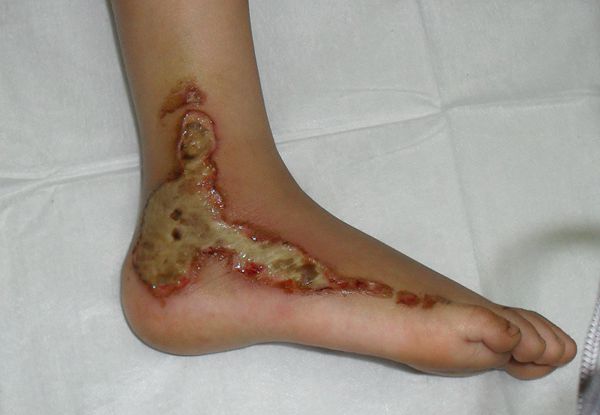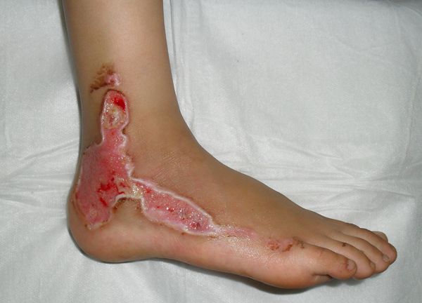病例简介;患者,女,8岁。骑自行车时被车轮蹩伤(图1),随即外涂湿润烧伤膏,应用3天,疗效不佳;来诊改用生肌育肤膏包扎疗法,3天后创面呈淡红色,有生机(图2);继续以生肌育肤膏包扎,隔日一次,至第10天创面基本再生修复(图3)。但愈合后未随访,故无预后照片。