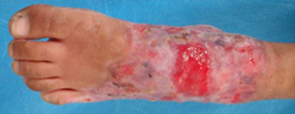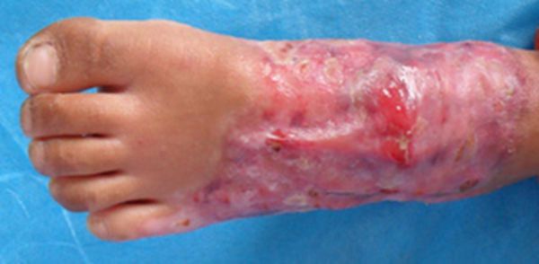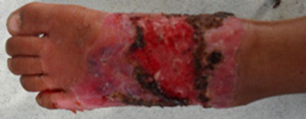 图1 左足烫伤,残余创面。