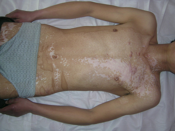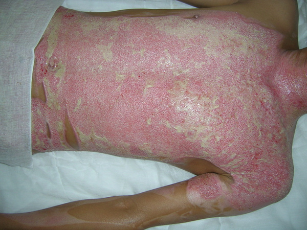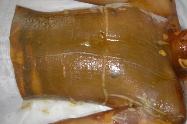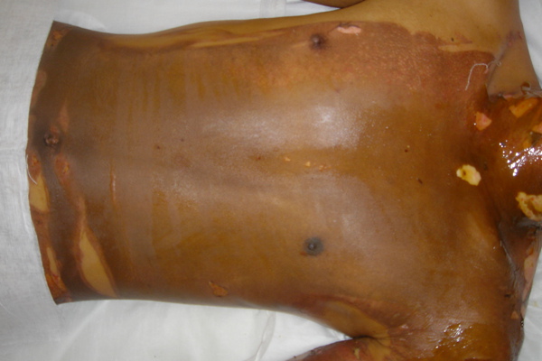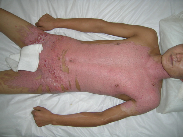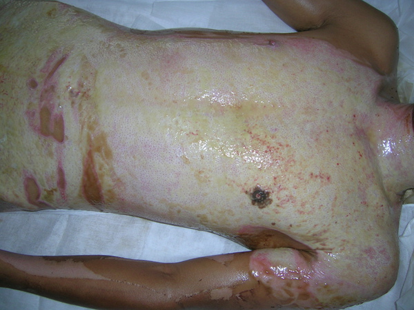 图1 颈、躯干及左上肢深Ⅱ°、Ⅲ°烧伤