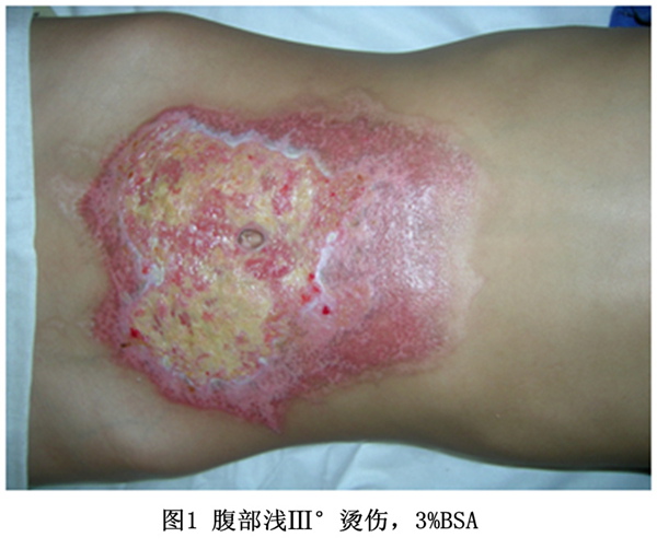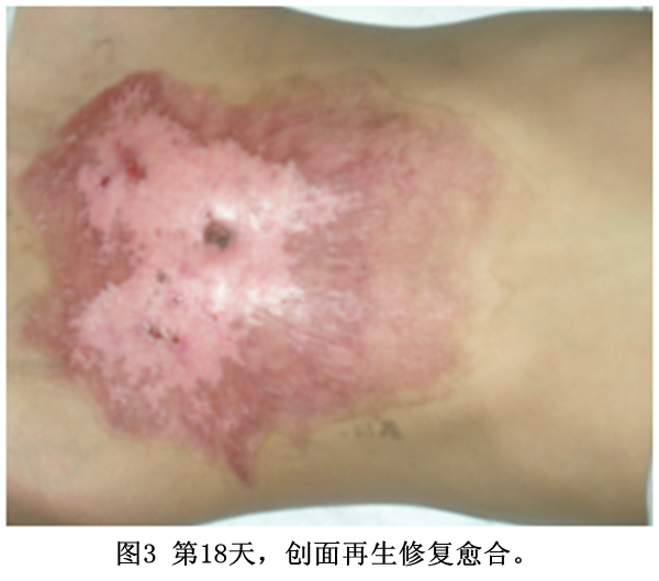 【病例简介】患者女,11岁。住址:兖州市小孟镇 住院号:0703147625 腹部因热水袋破裂而烫伤,诊断:烧伤(热水)3%BSA,浅Ⅲ°,腹部,伤后用民间验方治疗一个多月未愈(图1),改行一途牌生肌育肤膏治疗,暴露疗法,涂药厚度1mm,每4-6小时换药一次;至第7天,创面坏死组织被消化清除,创面内再生“皮岛”(图2),继续用药,至第18天创面再生修复愈合,愈后无瘢痕(图3)。