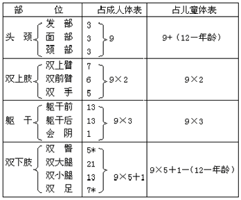 表1.人体体表面积九分法